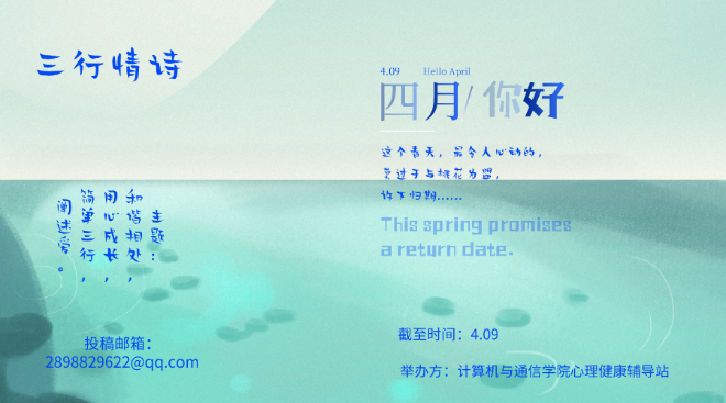 为教育引导学生学会情绪表达,更好地抒发自己的情感,计通心理健康辅导站聚焦广大学生的心理,鼓励同学们用三行情诗的形式,简化繁琐的爱意,唤起同学们内心对美好生活的向往和诗情画意。