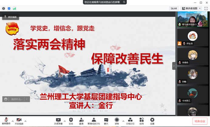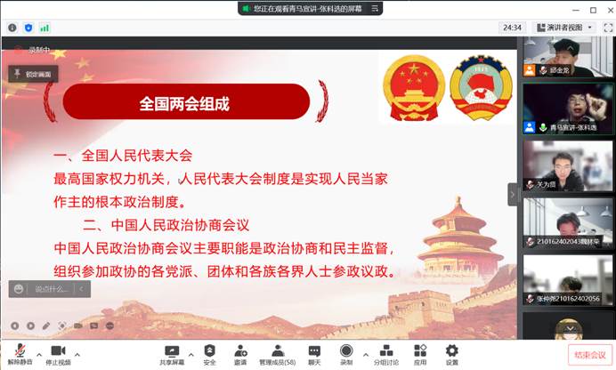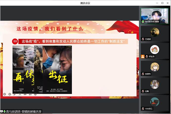 2022年4月8日晚,校团委“青马工程”宣讲团成员曾猜、张科选和金行走进计算机与通信学院2021级计算机科学与技术二班团支部,分别以“致敬抗疫英雄”、“青年担大任,强国正当时”、“聚焦2022年全国两会”为主题进行线上宣讲。