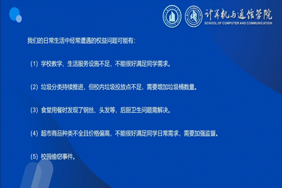 会议中,学院学生会权益部负责人张晶对权益知识与维权途径进行了介绍。张晶介绍了多个大学生维权的案例,对其逐个进行分析,并提供了正确维护权益的方法,以供同学们参考。最后,就部分班级班委代表提出的有关宿舍用电消防安全、食堂问题、学生卡充值与挂失、校车、快递等问题做了集中解答。