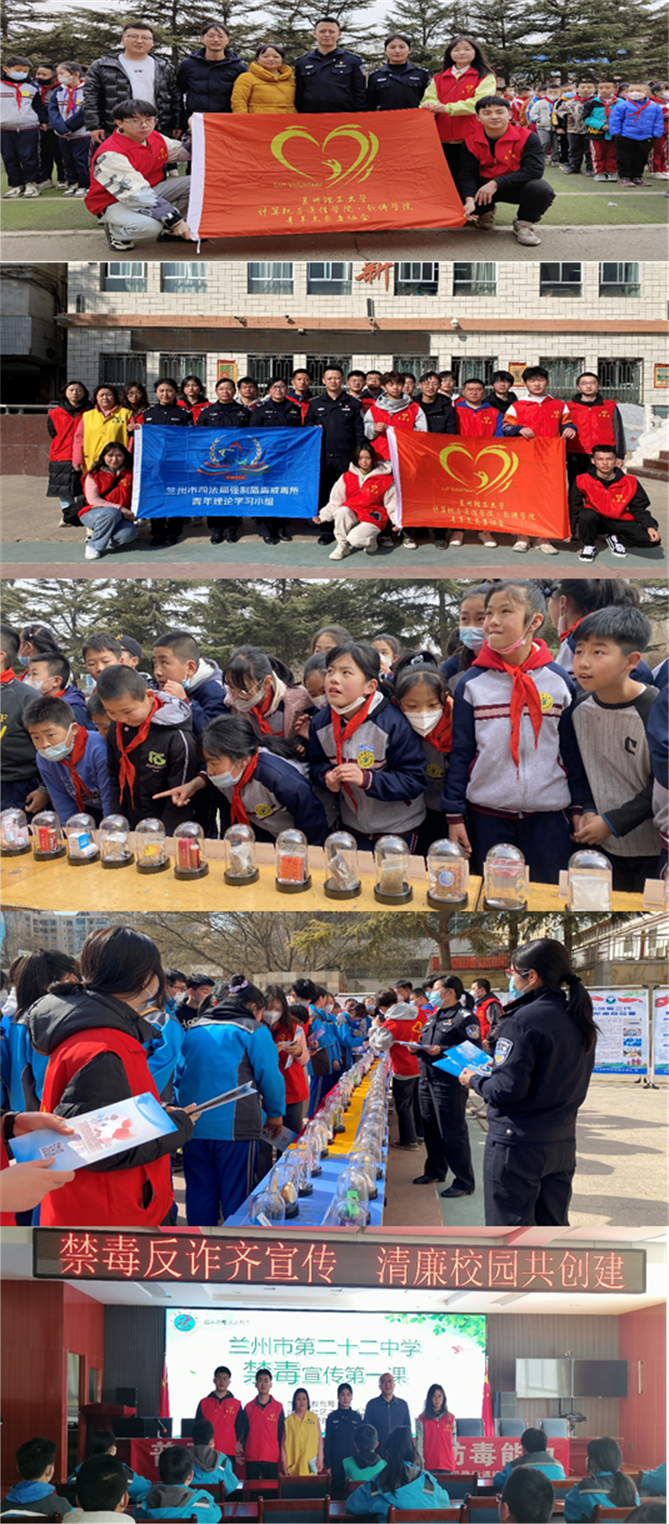 2023年2月28日下午、3月1日下午,计算机与通信学院青年志愿者服务队协助兰州市司法局强制隔离戒毒所在七里河区崔家崖小学、兰州市第二十二中学开展“禁毒教育宣传进校园”志愿服务。参与志愿服务的还有七里河公安分局秀川派出所部分民警、秀川街道以及建兰路街道部分工作人员;七里河崔家崖小学、兰州市第二十二中学师生共一千余人。