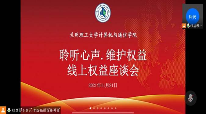 为实时保障学生在校权益,进一步加强学生的权益维护意识。计算机与通信学院于2021年11月21日举办权益座谈会活动。会议由计算机与通信学院学生会权益部负责人李毅扬同学主持。