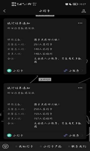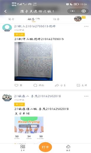 本次活动一方面要求每位参与者利用百词斩、扇贝等背单词软件,在“微信小程序—小打卡”中发送截图来记录自己每天学习的单词量。另一方面督促同学们进行四级模拟试题考试,在“微信小程序--小打卡”中进行打卡。同时建立“携手共进四六级—云自习室”为低年级同学们解答疑惑,分享备考策略。