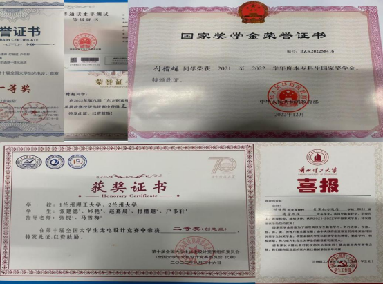 学习方面:潜心研学,坚持不懈,2021至2022学年,加权平均分91.54分,位于专业第一,综合测评位于专业第二,一次性通过英语四级。荣获2021至2022学年国家奖学金和校三好学生标兵荣誉称号,获得2022年第十届全国大学生光电设计竞赛全国二等奖、东方财富杯省优秀奖、第十届大唐杯省三等奖。