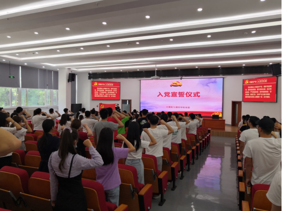 之后,举行了新党员入党宣誓、老党员重温入党誓词仪式。在奏响庄严的《国际歌》后,党员们怀着无比激动的心情,面向鲜红的党旗,向党发出了铮铮誓言:“我志愿加入中国共产党,拥护党的纲领,遵守党的章程……”铿锵有力的宣誓声抒发了党员对党忠诚的炽热情感,将在今后的学习和工作中践行自己的庄严誓言,不断提高自身修养,全心全意为人民服务,做一名合格共产党员。