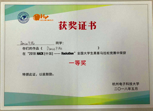 2018年5月19日至5月20日,Hack{中国}——2018全国高校黑客马拉松比赛在杭州电子科技大学举行。由冯涛教授指导的应宗浩同学获邀参加本次大赛,并与来自浙江大学、哈尔滨工程大学等高校的四位学子组成团队Dance4Me,共同完成作品《Dance4Me》的开发,取得全国第一名的优异成绩。