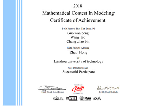 MCM2018年竞赛日期为2月10日至2月13日,正是我国传统节日春节的前两天,我院学生郭万鹏、王涛和常兆斌等三位同学,在指导教师赵宏教授的带领下,克服寒假和春节来临前的各种困难,报名参加竞赛,经过为期四天的努力,于2月13日向竞赛组委会提交了参赛论文。竞赛组委会对论文进行评审后,给郭万鹏、王涛和常兆斌等三位同学组成的团队颁发了“Successful Participant”奖励证书,该奖励相当于国内三等奖。