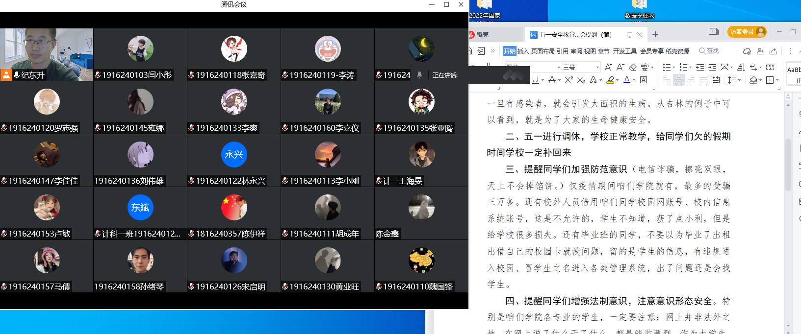 4月27日下午,学院在会议室召开五一学生安全教育主题班会,学院高国礼书记、陈育苗副书记及全体班主任参加。
