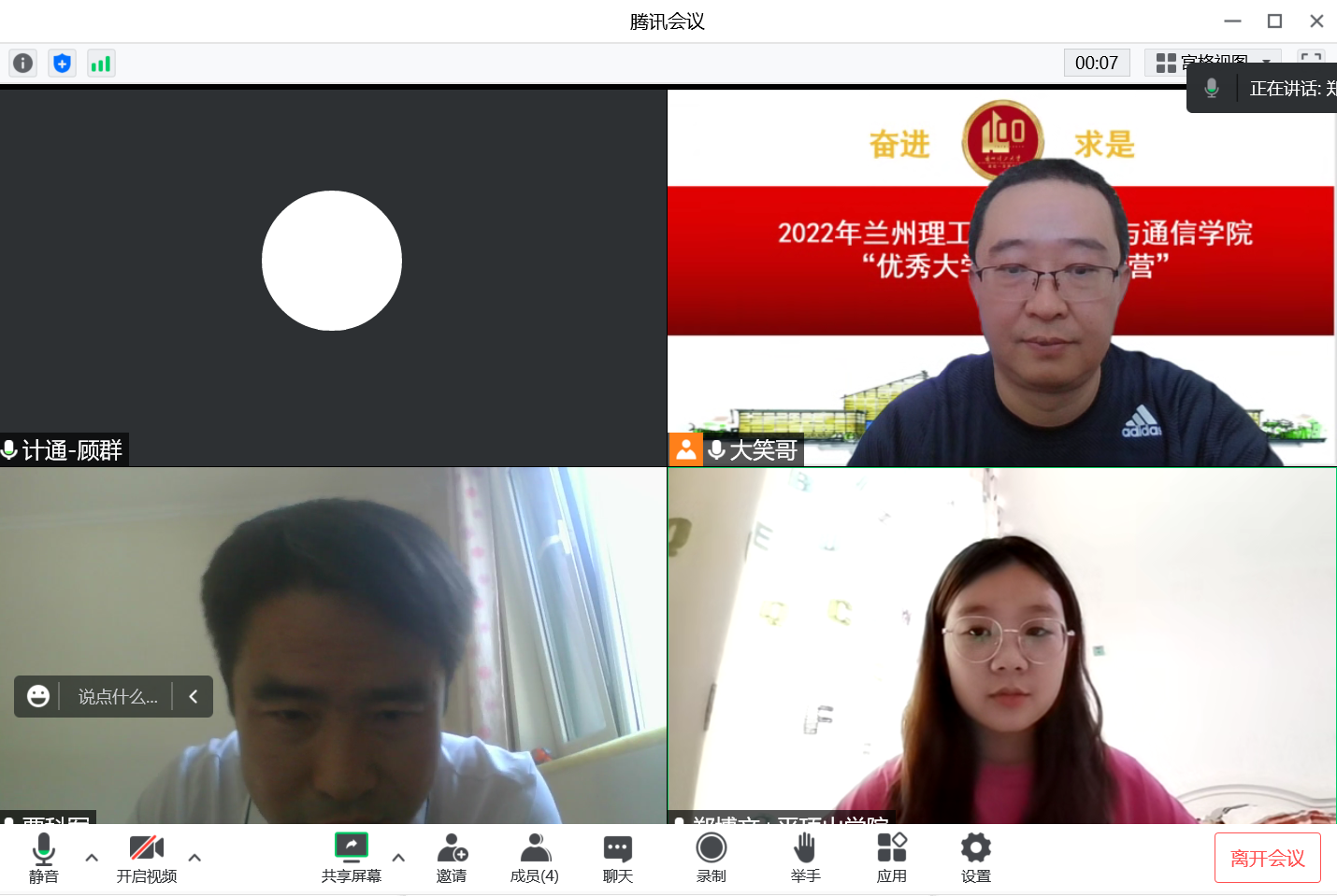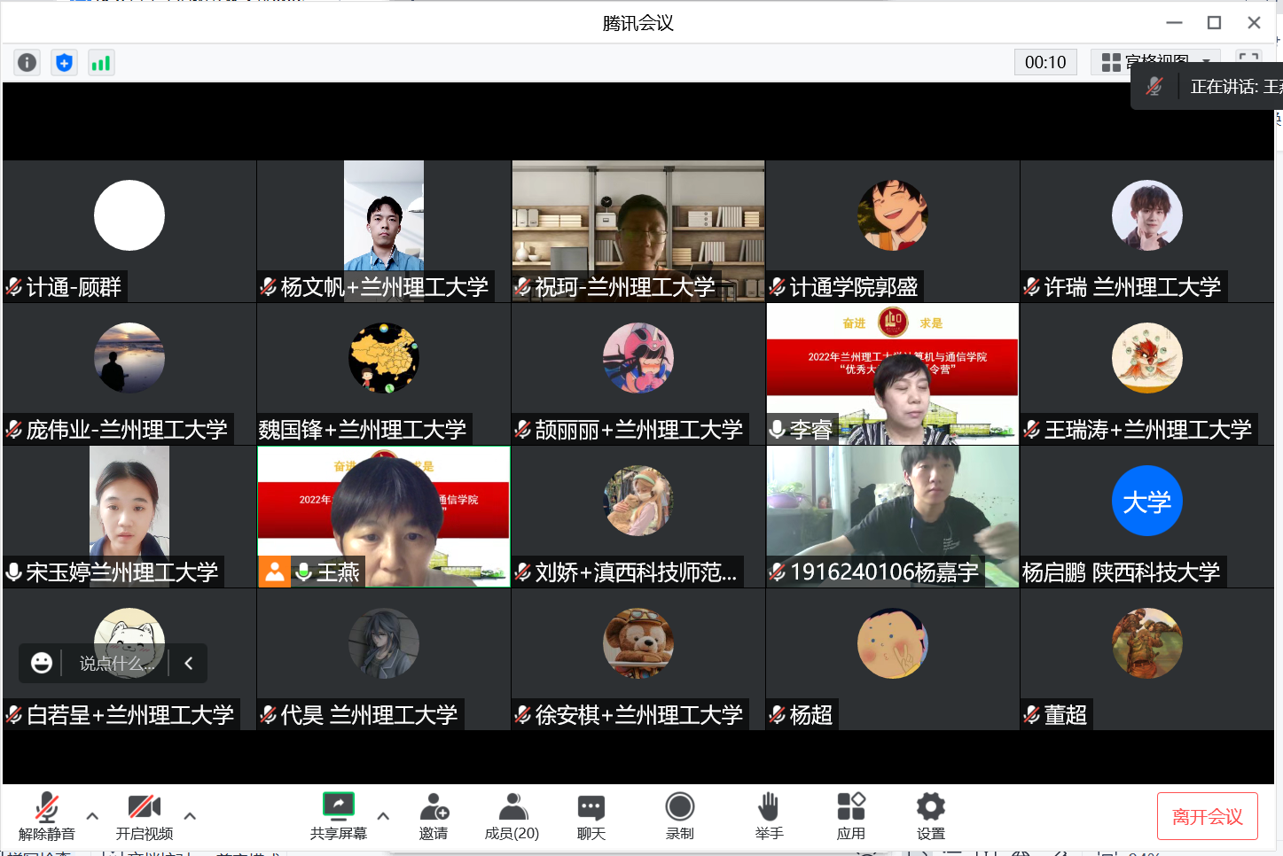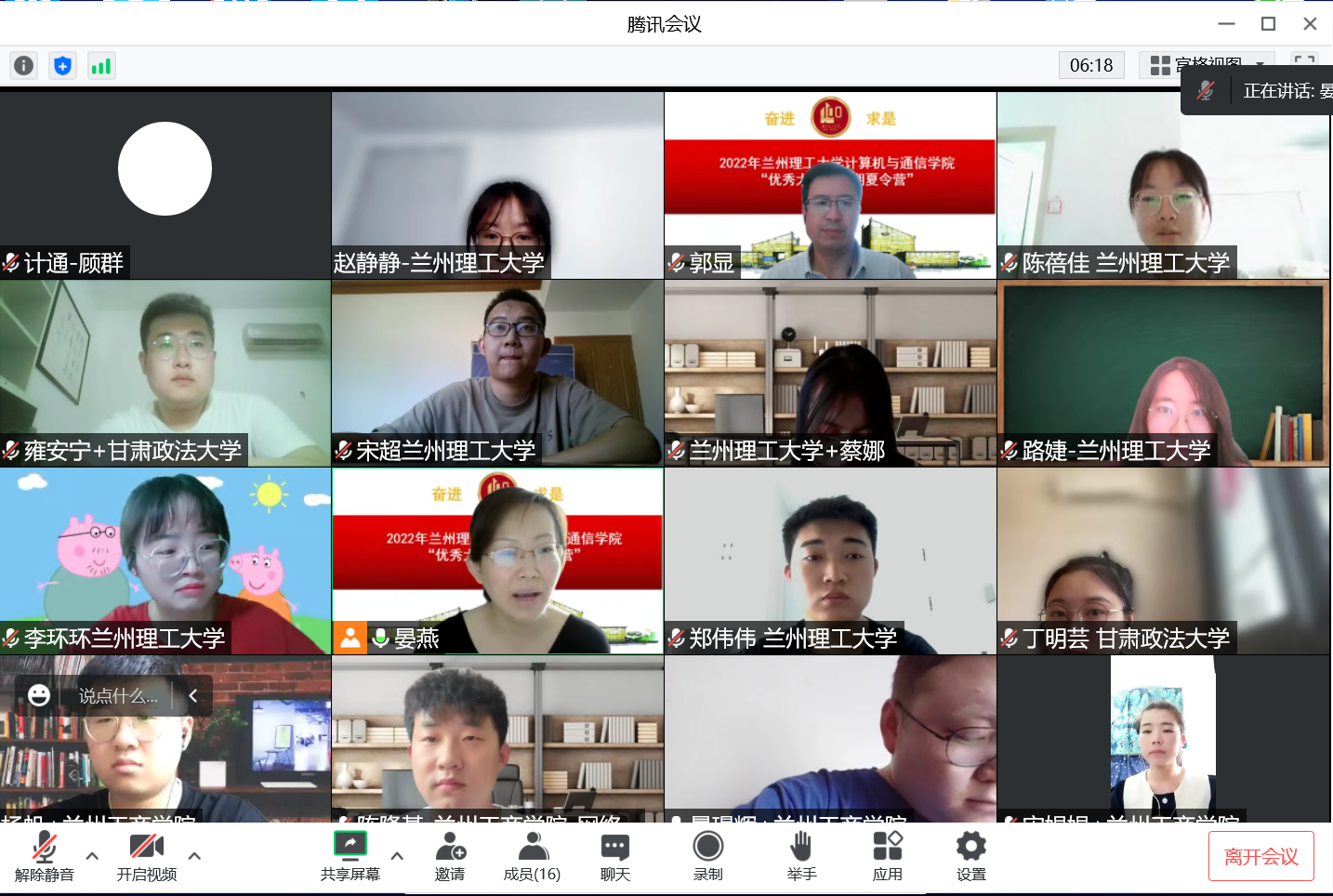 7月29日上午,计算机与通信学院“2022年优秀大学生暑期夏令营”开营仪式在腾讯会议线上进行。本次会议由计通学院副院长李晓旭教授主持,计通学院院长冯涛教授、副院长年福忠教授、赵付青教授、王惠琴教授、顾群副教授和来自9所不同院校的56名营员线上参加了开营仪式。