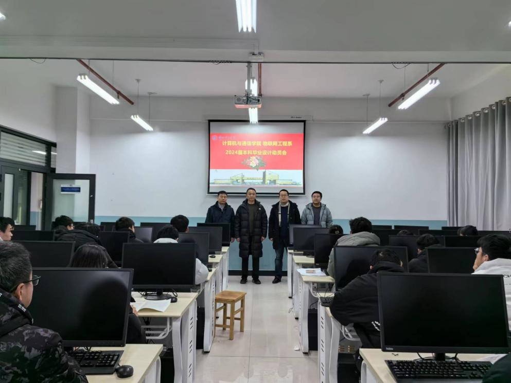 12月12日上午,物联网工程系在舒卷楼305实验室召集2024届毕业生召开了本科毕业设计动员会,会议由物联网工程系主任张恩展副教授主持,计算机与通信学院副院长张玺君副教授、物联网工程系副主任张明虎副教授到场为学生们进行了现场动员指导。