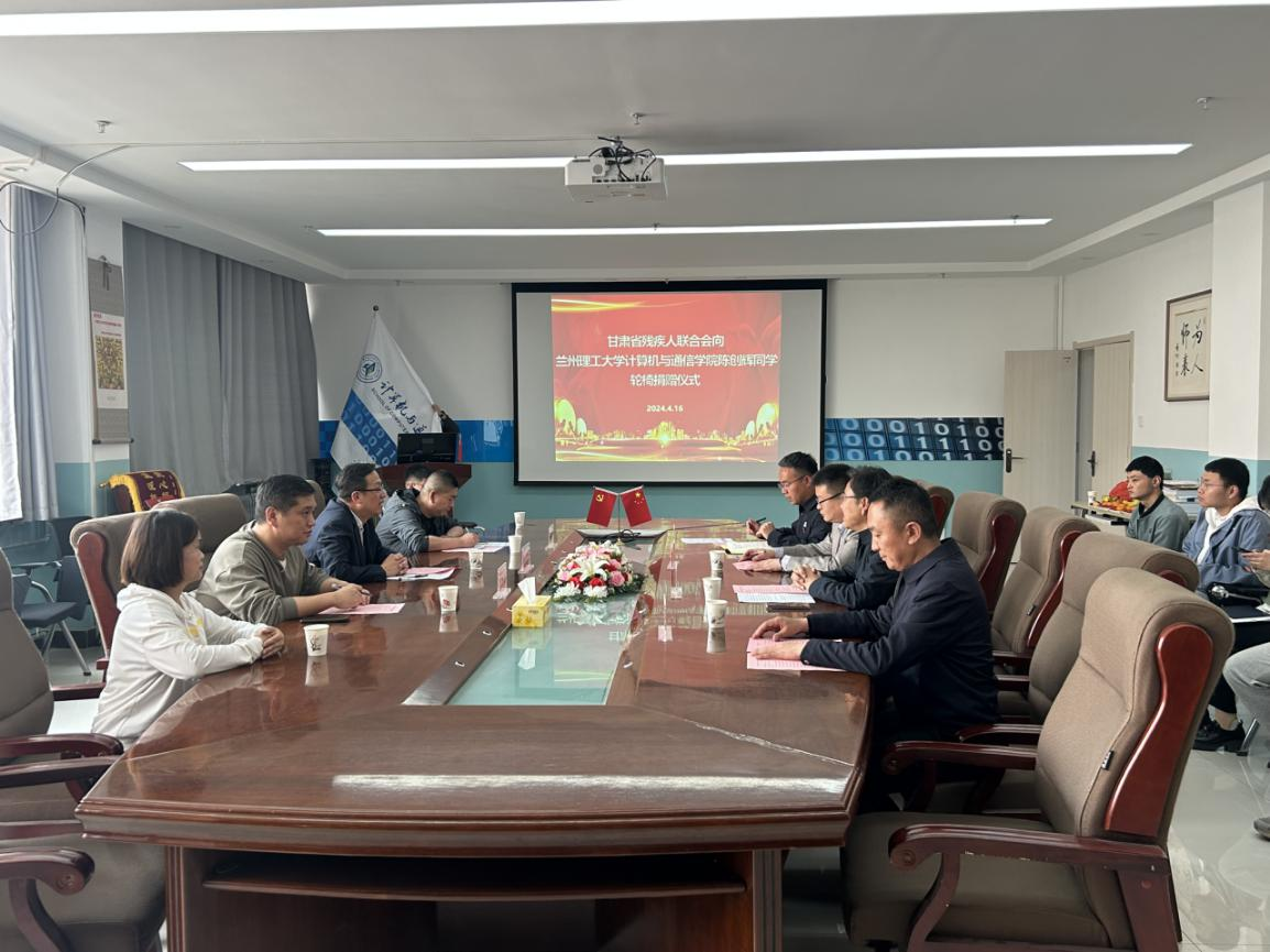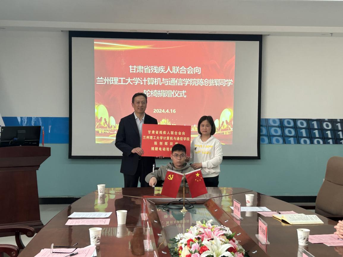 4月16日下午,计算机与通信学院举办甘肃省残疾人联合会向计通学院2023级软件工程1班陈创辉同学捐赠电动轮椅车仪式。出席仪式的有省残联辅助器具资源中心副主任王建忠、科长夏步荣,党委学生工作部副部长刘洪国,计算机与通信学院党委书记高国礼、副院长张玺君、党委副书记来明展,陈创辉、陈创辉母亲、学院教师代表以及“陈创辉助学帮扶小组”代表。议程由学院党委副书记来明展主持。