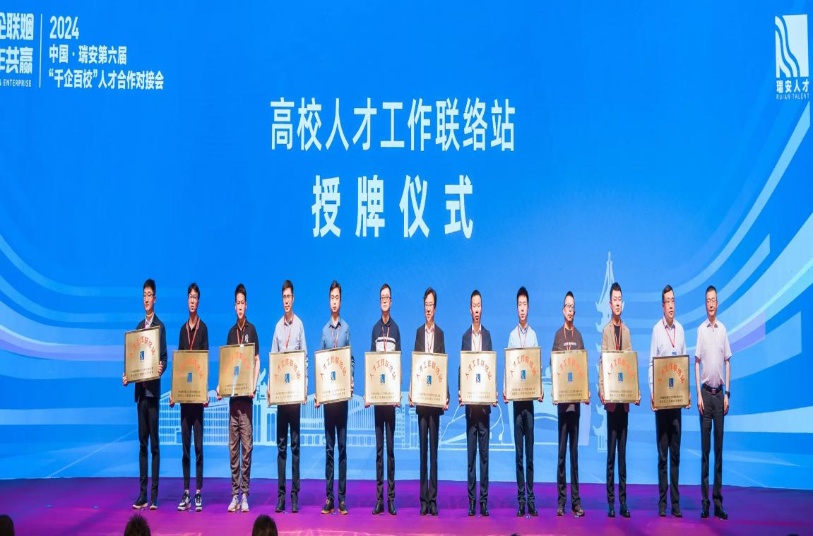 22日上午,一行参加2024中国·瑞安第六届“千企百校”人才合作对接会,高国礼书记代表学校就业指导服务中心授领“高校人才工作联络站”站牌并对接洽谈校企合作与现场招聘。