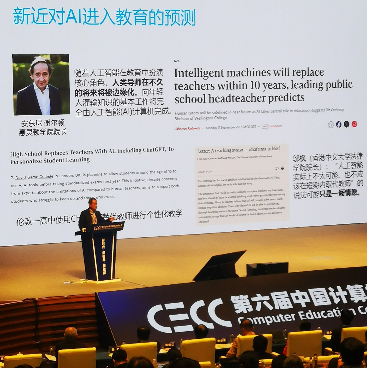大会期间,众多知名专家学者发表主题报告,深入剖析计算机学科发展面临的新挑战与新机遇,分享人工智能赋能教育创新的实践经验,探讨互动式教学新模式以及大模型技术对教育变革的深远影响。教育部高等学校大学计算机课程教学指导委员会主任委员、中国工程院院士郑庆华(图1),中国科学院院士梅宏等专家的报告(图2),为参会者带来了计算机教育领域的前沿学术成果和宝贵实践经验,引领了教育创新的思潮。