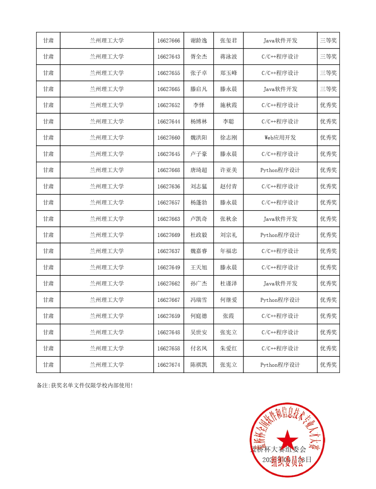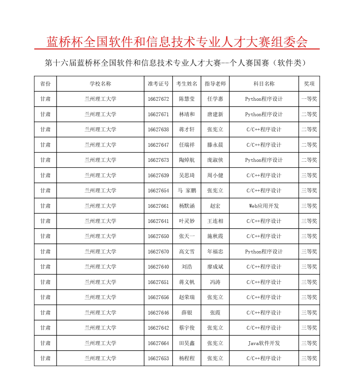 兰州理工大学作为全国总决赛分赛点之一,承担了甘肃赛区共15所高校中获省赛一等奖的173名软件类参赛选手的比赛。我校入围总决赛的39名参赛选手均获奖,其中获国家一等奖1项,国家二等奖4项,国家三等奖17项。