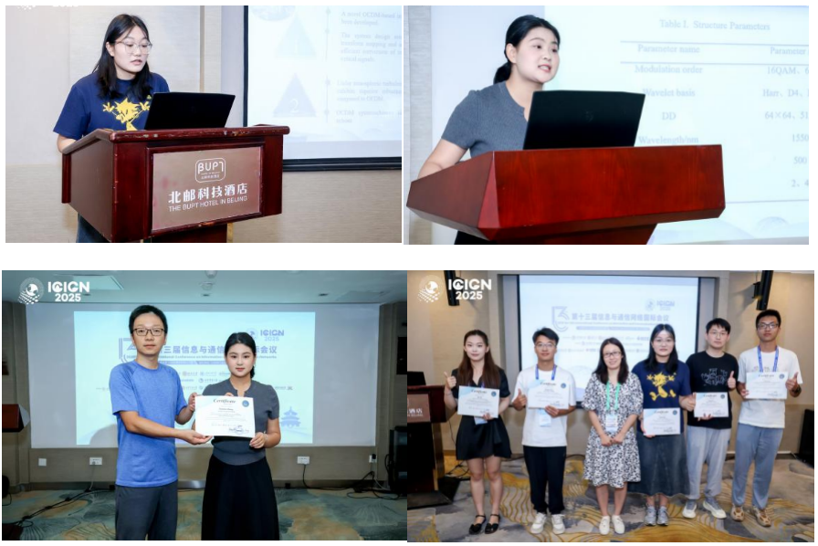 兰州理工大学计算机与人工智能学院曹明华教授、研究生史鑫卉和张甜甜参会,并作了分会场的报告。史鑫卉的报告题目为《OCDM Integrated LiDAR and Communication System for UAVs》,介绍了OCDM激光雷达通信一体化系统进行测距等相关应用。张甜甜的报告题目为《Joint Noise Whitening and Oversampled MRC Detection for W-OTFS Systems in Gamma-Gamma Turbulent Channels》分享了W-OTFS在白化信道下的检测算法以及降低PAPR的方法。