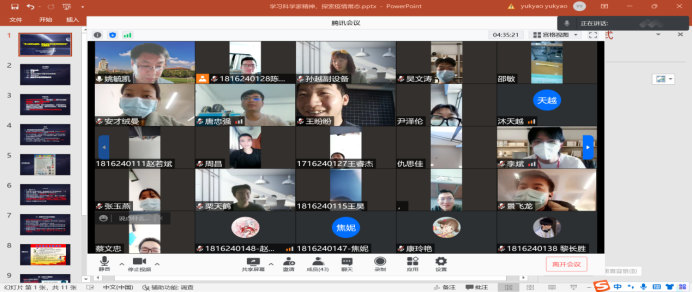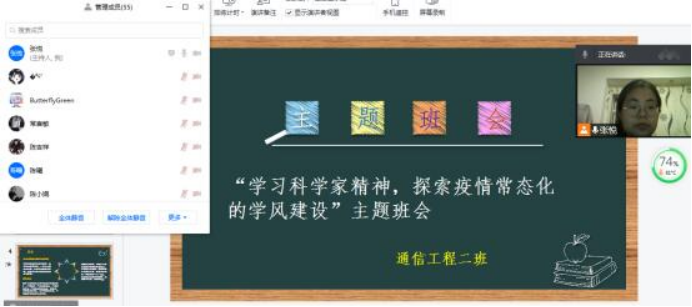 11月初,计算机与通信学院各班使用腾讯、钉钉视频会议等线上平台召开了本月班主任会议。会议由学院统一传递中心思想,各班班主任主持,全班学生参加。会议主题为“学习科学家精神,探索疫情常态化的学风建设”。会议内容主要分为以下几个方面。