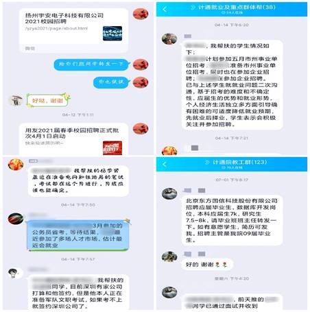 齐心协力、建立促就业联动机制。学院积极统筹各方力量,逐步建立院领导、各教学基层单位、各学生党支部、研究生导师、毕业设计导师、班主任、实训机构老师、校友及学生口全体老师全员促就业机制。对重点群体毕业生建立“一对一”帮扶,对帮扶老师单独建群,建立重点群体帮扶“随时帮扶、随时反馈”机制,逐渐形成人人关心就业、全员促进就业的良好局面。