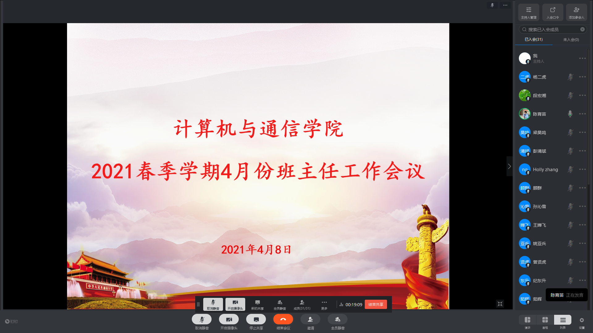 4月8日晚,计算机与通信学院通过钉钉视频会议召开了班主任工作会议,会议由学院党委副书记陈育苗主持,学院党委书记曾贤虎、全体班主任参加。