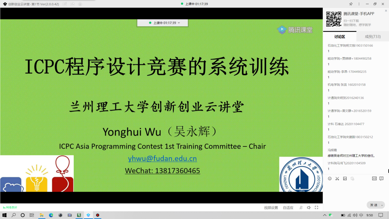 2021年2月6日,由创新创业学院承办、复旦大学副教授吴永辉博士主讲的ICPC程序设计竞赛的系统训练(Systematic Training for ICPC Programming Contests)讲座圆满结束,共有1003人参加此次讲座。