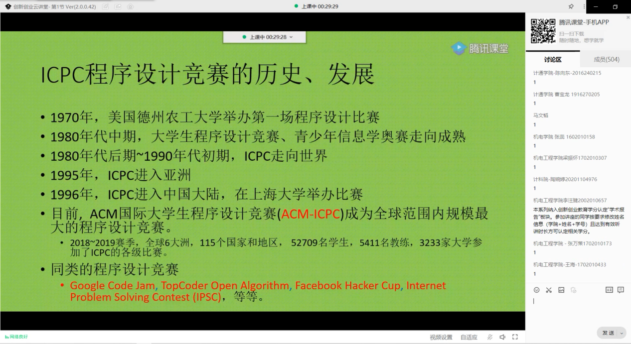 受疫情影响,此次讲座采用了“腾讯课堂+直播”的授课方式。通过此次讲座,学生从背景和课程体系建设两个主要方面了解ICPC程序设计竞赛。讲座主要针对程序设计训练基础相对薄弱的学校、以及准备进行程序设计入门训练的同学,进行程序设计基础训练,参加学校涉及两岸四地200多家大学,其中既有985、211的一本院校,也有职业技术和应用技术型院校,此外,港澳台地区院校也积极参与。