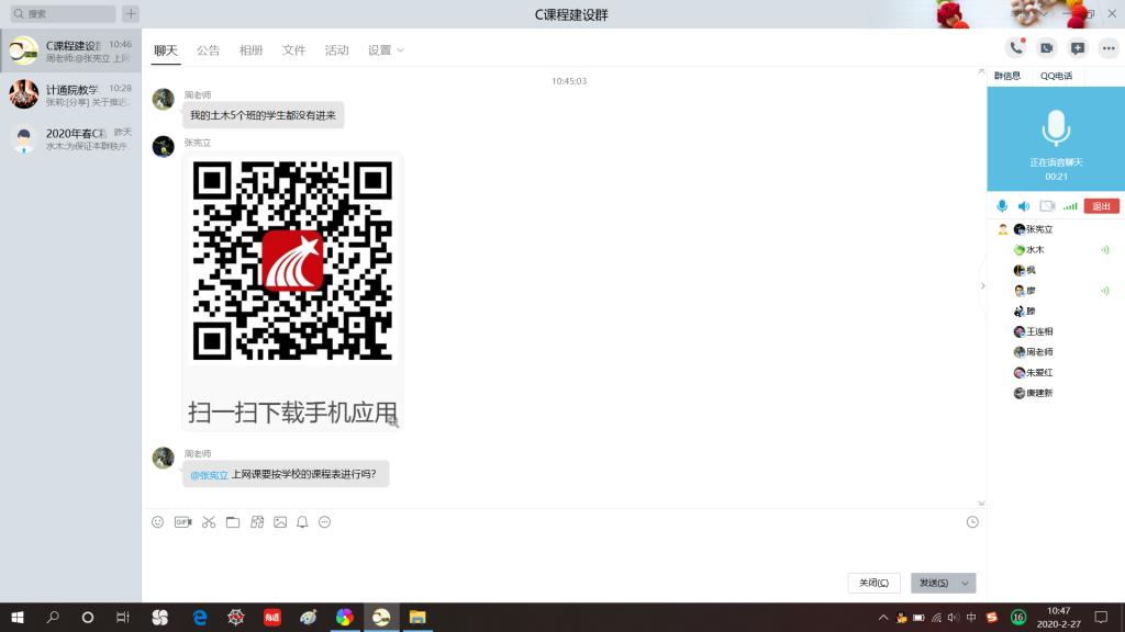 为了让老师们尽快熟悉要用的功能,公共课部组建了“C程序建设群”,公共课部张宪立老师通过语音、视频的方式连续3天在群内讲授SPOC平台的使用方法,语音视频结束后还以文字的方式向部门老师提供咨询,从2月12日课程建设开始,基本上是“不分昼夜、看见就回”。为老师们顺利建课提供了极大的帮助。老师们也在群里共享信息,互帮互助。