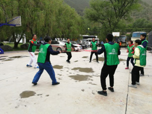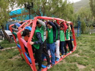 鼓动人心:一个大鼓,把鼓的四周拴上16根绳子,每根绳子由一个人牵着,在鼓上放一个球,然后16人颠球,看哪一组一次颠得多,颠得多者为胜。这个项目全体学员取长补短、团结协作完成共同目标能力,培养教师不怕挫折、不断进取,争创佳绩的意识,感受互相鼓励对完成任务的积极 作用。