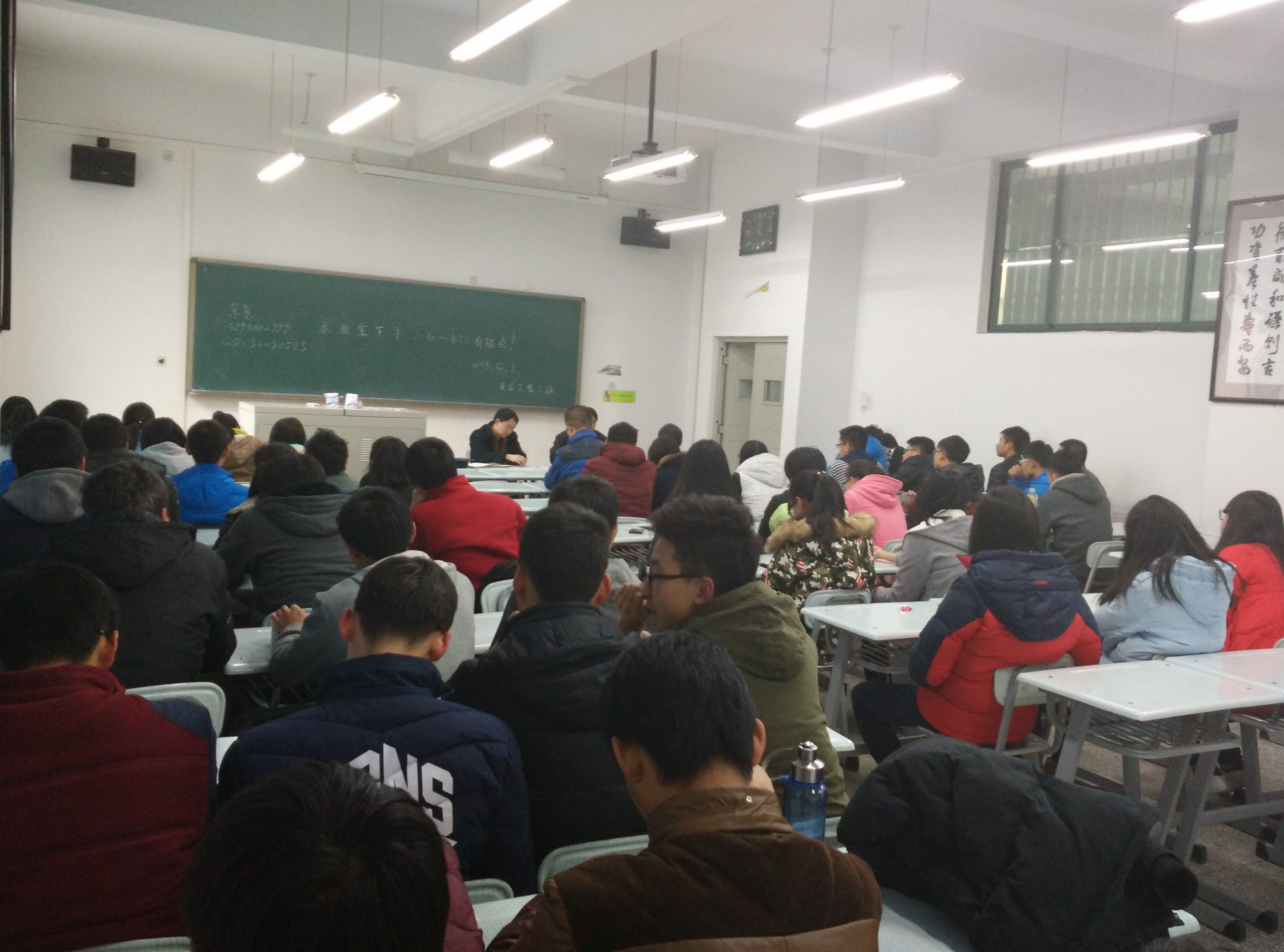 为引导同学形成正确的学习观、人生观,明确就业方向,同时了解学生日常生活情况,12月8日下午,后勤集团余勇副总经理与我院15级通信2班学生见面并召开了主题班会,会议由通信2班班主任张恩展老师主持,15级通信2班全体学生参加了此次班会。