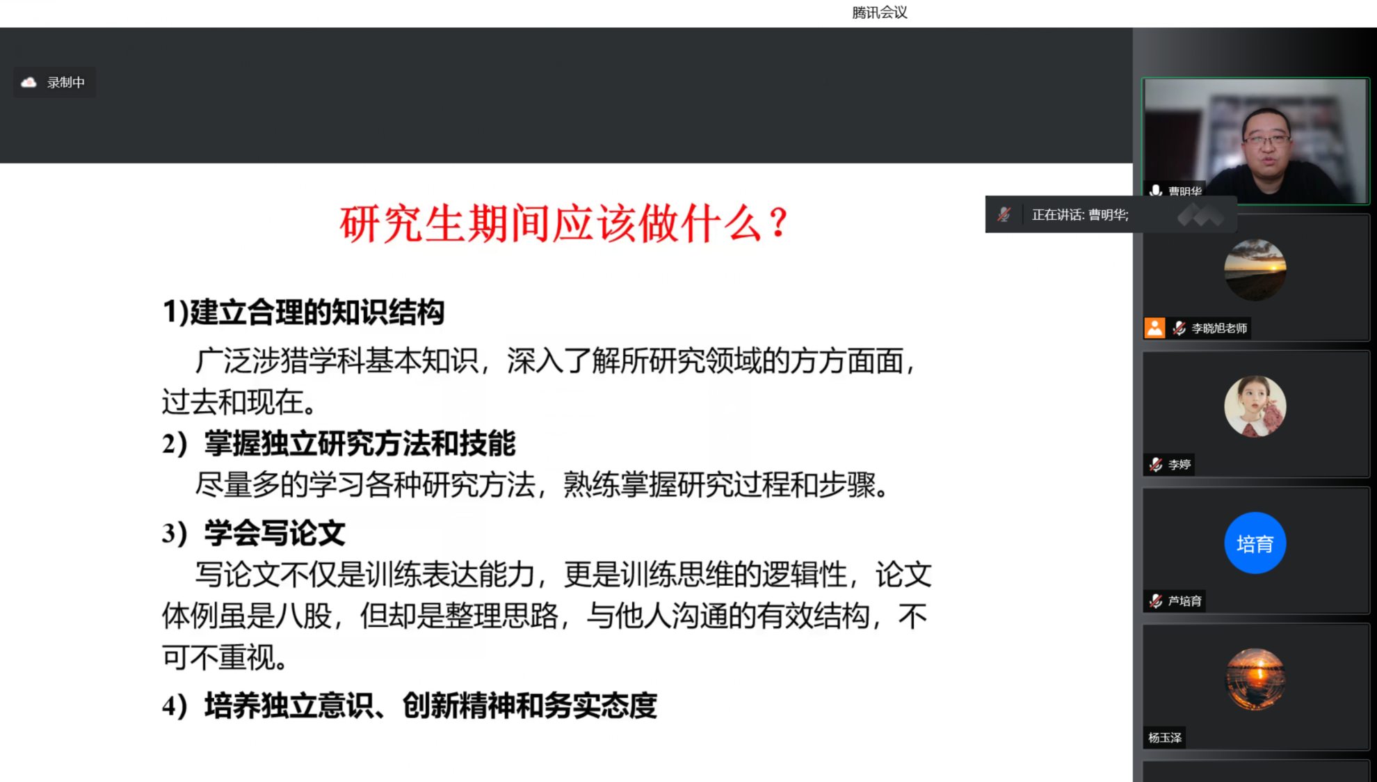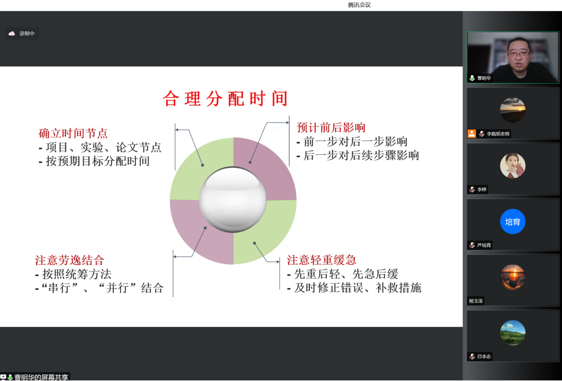 曹明华教授结合建立合理的知识结构,掌握独立研究方法和技能,学会写论文,培养独立意识、创新精神和务实态度,如何做好研究生阶段规划,科研选题的原则与要素,科研心态,研究生期间的注意事项以及能力培养等方面进行指导。研究生阶段是新生的赶考之路,只要我们坚定正确的目标航向,以积极向上的心态做学问,砥砺奋斗,一步一个脚印,才能绽放青春光彩!