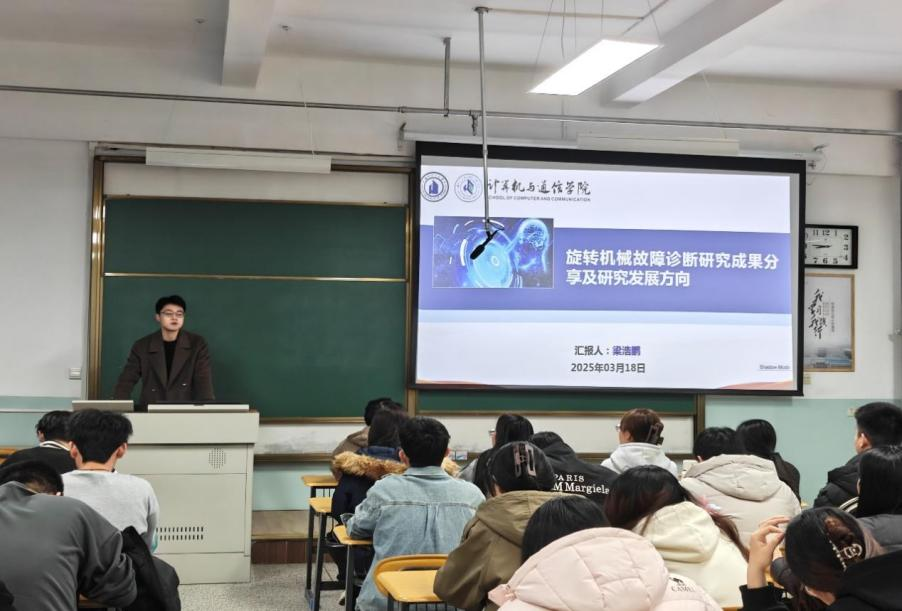 梁浩鹏博士长期致力于AIGC(生成式人工智能)和工业数据分析等领域的研究,重点聚焦AIGC模型优化、工业故障诊断、多模态信息融合、视频目标跟踪等方向。报告会上,他围绕“旋转机械故障诊断研究成果分享及研究发展方向”主题展开报告,强调了旋转机械故障诊断研究的重要意义和工程价值,详细剖析了在实际故障诊断过程中所面临的挑战与难题,毫无保留地分享了在噪声环境故障诊断、小样本故障数据扩充、寿命预测等领域具有极高创新性与实用价值的研究成果,展望了旋转机械故障诊断领域未来的研究方向,包括物理神经网络、预训练大模型微调等前沿研究方法,为师生们打开了学术视野。梁浩鹏博士还将自己丰富的科研经验倾囊相授,分享了如何合理利用AI工具辅助科研工作,令在场师生受益匪浅。