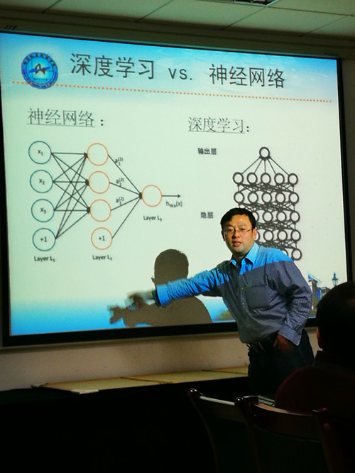 赵教授首先从深度学习的概念说起,谈及深度学习流行的原因,进而对深度学习和神经网络进行比较,比较了它们的相同点和不同点,得出深度学习效果虽然更好,但面临的问题也更多的结论。接着,赵教授向大家介绍了一个清晰而高效的深度学习框架Caffe。并给大家演示了一个识别实例,识别了图片当中的person,car,dog,motorbike等。给了大家很大的启发,原来深度学习的应用就在我们身边。最后,赵教授告诫全体研究生要专心致志搞科研,向科研的更高端迈进。