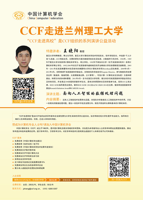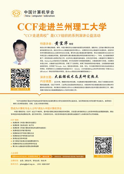 10月13日下午13:40时,CCF大数据专家委员会来我校作专题报告。此次报告会特邀讲者包括复旦大学教授、博士生导师,复旦大学计算机科学技术学院院长王晓阳,国防科技大学计算机学院研究员彭绍亮博士,南京大学计算机博导黄宜华教授。报告会在弘文宾馆2楼报告厅举行,由计通学院冯涛院长和赵付青院长主持,计通学院全体教师、研究生和本科生参加了此次报告会。