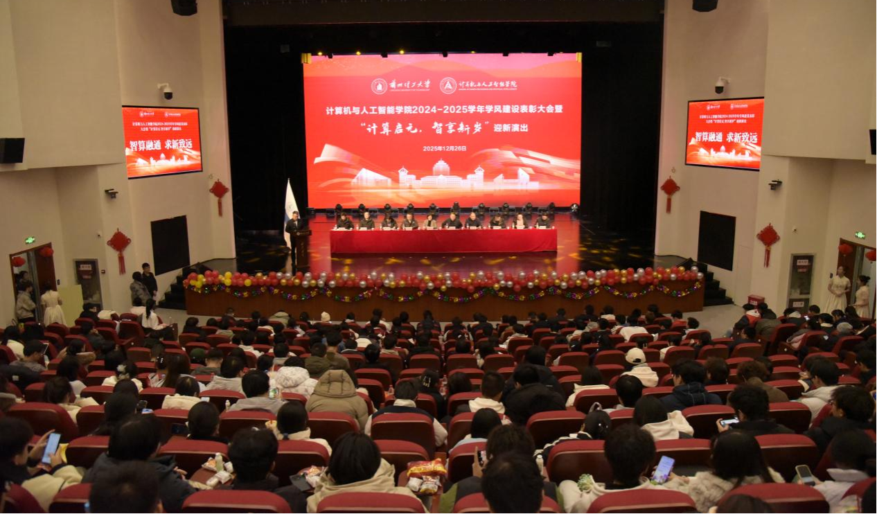 为集中展示育人成果,表彰先进典型,凝聚发展共识,计智学院于12月26日晚在彭家坪校区大学生活动中心红柳剧场隆重举行2024-2025学年学风建设表彰大会暨“计算启元 智享新岁”迎新演出。校学生就业创业服务中心主任、学院领导班子、各系部主任、全体辅导员,获奖师生代表及2025级全体本科生参加活动。会议由学院党委副书记主持。