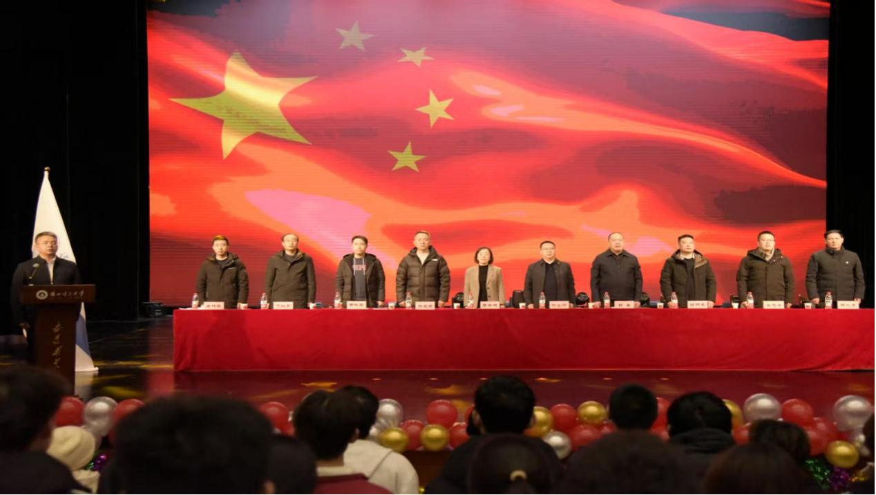 大会在庄严的国歌声中拉开序幕。学院院长首先致新年贺词,向全体师生送上美好祝福,对学院过去一学年在学风建设和人才培养等方面取得的丰硕成果予以充分肯定,勉励全体师生在新的一年里再接再厉、追求卓越。随后,2025级本科生代表韩童同学发言,她结合入学以来的亲身感悟,生动阐述了对“奋进求是”校训精神的理解与践行,展现出2025级新生潜心学业、传承“红柳精神”的坚定决心,并号召同学们以自信为帆、以实干为桨,将个人理想融入国家发展,在知行合一中彰显新时代青年的使命担当,共同书写属于兰理工人的青春篇章。