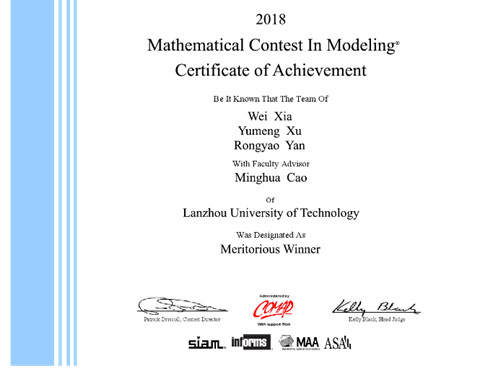 获奖证书 4月21日,2018年美国(国际)大学生数学建模竞赛(MCM/ICM)成绩揭晓。由我院曹明华副教授指导,我院夏伟、颜荣耀同学以及理学院徐雨萌同学共同完成的参赛作品《The analysis o...